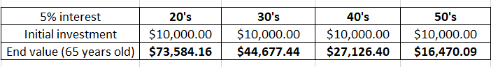 Let’s take a very simple example of savings $ 10 000.00 at 25, 35, 45 and 55. The yearly interest rate is 5%. You never add to it and cash-out these savings when turning 65.